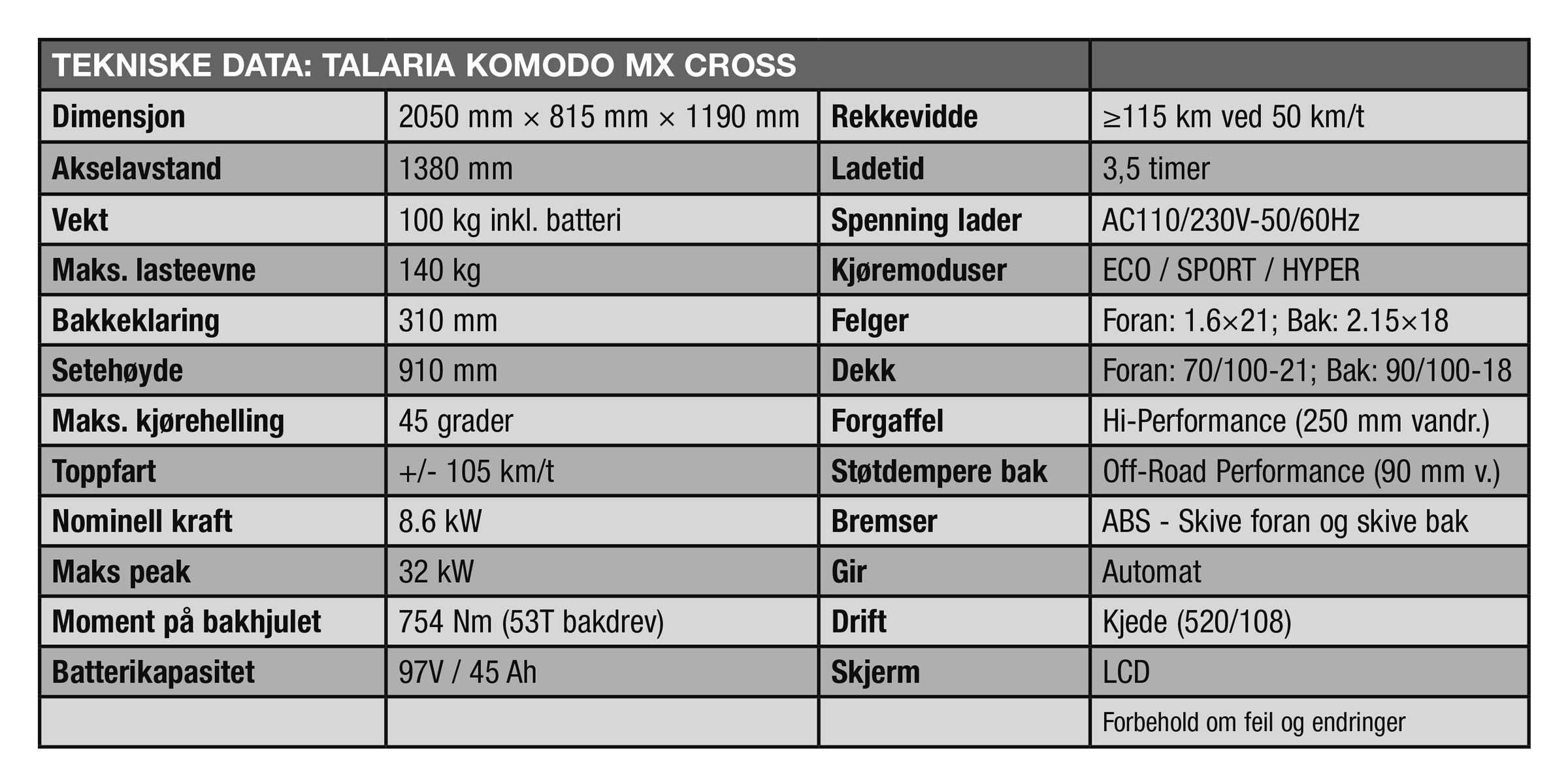 Talaria Komodo er ikke bare en elektrisk motorsykkel. Det er en revolusjon innen elektrisk terrengkjøring. Kjør hardere, raskere og lenger – og legg konkurrentene i støvet.