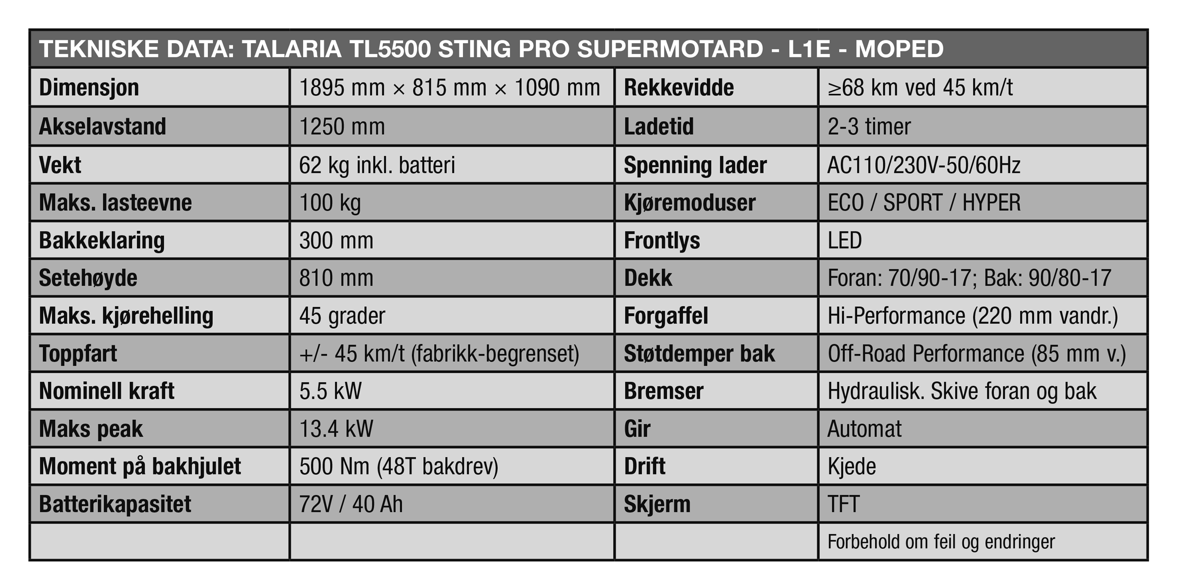 - 3 kjøremoduser inkludert Hyper-modus (unikt for TL5500)